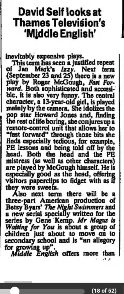 Imdb sadly hasn’t thrown up much info, but Roger McGough was involved with a Thames TV programme called ‘Middle English’, which ran throughout the 80s, providing a mix of documentaries and dramas. This feels like a really likely candidate, for two reasons: firstly, we definitely watched at least one other episode from the same series in school (an animated adaptation of ‘The Shrinking of Treehorn’ and secondly, there’s an episode from series 11 (1986, which totally fits the time-line for when I saw this) called . . . ‘Fast Froward’. There’s no other info out there at the moment, sadly, but this feels like a very definite maybe.”